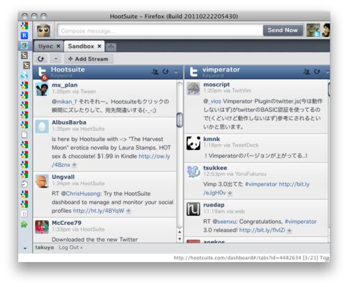 最近、HootSuite を使いはじめたのですが、日々使うものは自分好みにカスタマイズしたいという欲求に駆られるので、早速ユーザースタイルを作成。 http://userstyles.org/styles/44638?r=1298776784 # Steel Blue, Classic テーマ専用 変更内容は下記の通り…